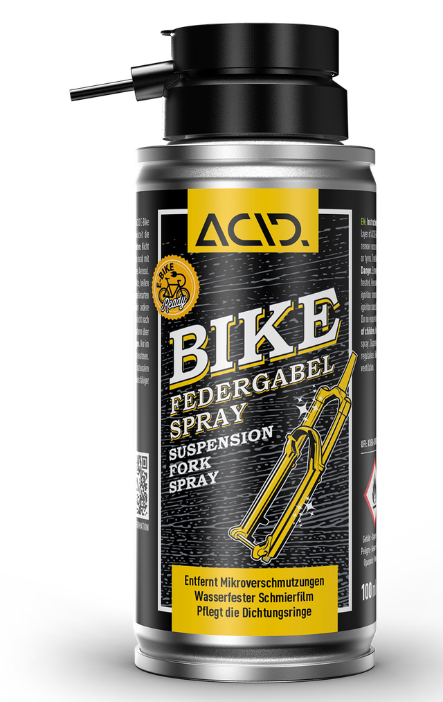Que ce soit en course, au bikepark ou lors d'une sortie d'une journée, une performance maximale ne vient qu'avec une suspension fonctionnelle. Le spray pour fourche ACID Bike protège et entretient tous les éléments de suspension du vélo, tels que les fourches, les amortisseurs et les tiges télescopiques. Il élimine rapidement et facilement la poussière et les micro-salissures, son film lubrifiant résistant à l'eau permet aux joints d'étanchéité de fonctionner en douceur et protège les surfaces des tubes de guidage. Pour une performance optimale en terrain accidenté et une durée de vie prolongée des pièces. Vous sentirez la différence !
