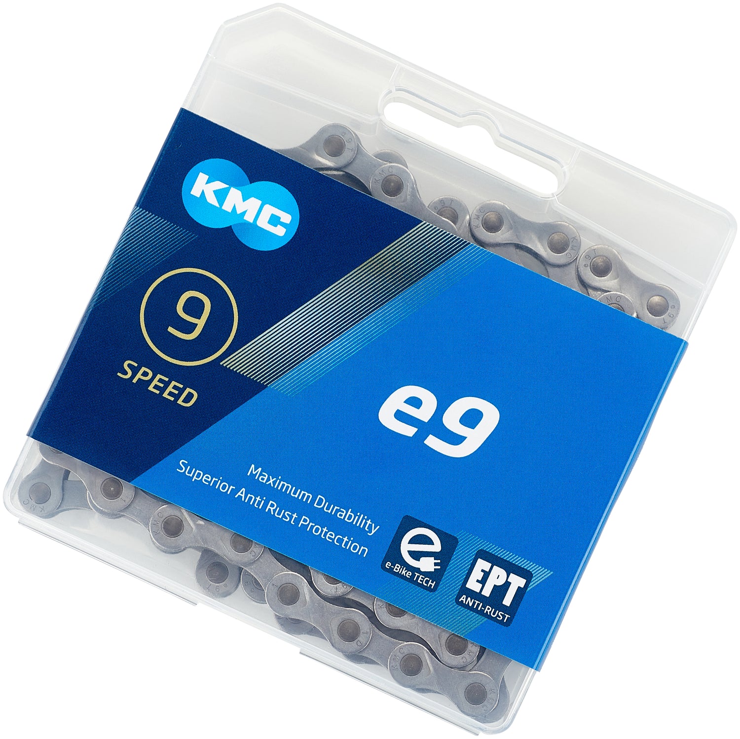 KMC präsentiert mit der e9 EPT eine maximal haltbare Anti-Rost- Kette für 9-fach Systeme an E-Bikes mit Mittelmotoren.
